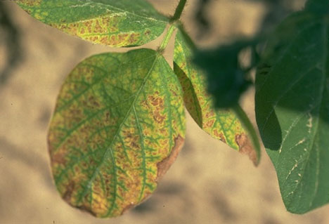 Condition: Carryover of atrazine or high rate of metribuzin; both herbicides are influenced by high soil pH making the herbicides more available to cause injury; eroded knolls in field are likely areas where injury may occur